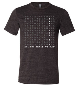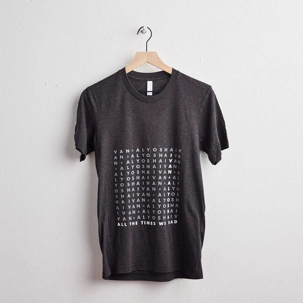 A heather gray Ivan & Alyosha shirt printed to commemorate All The Times We Had.